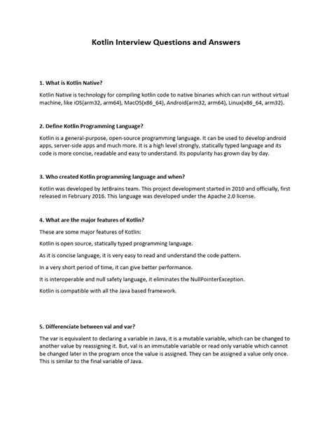 Kotlin Interview Questions And Answers Pdf - Questions & Answers. These most important questions are categorized for quick browsing before the interview or to act as a detailed guide on different topics in kotlin interviewers look for. On this page, we have given mostly all the interview questions of kotlin which are generally asked by the candidates in big mncs interviews.